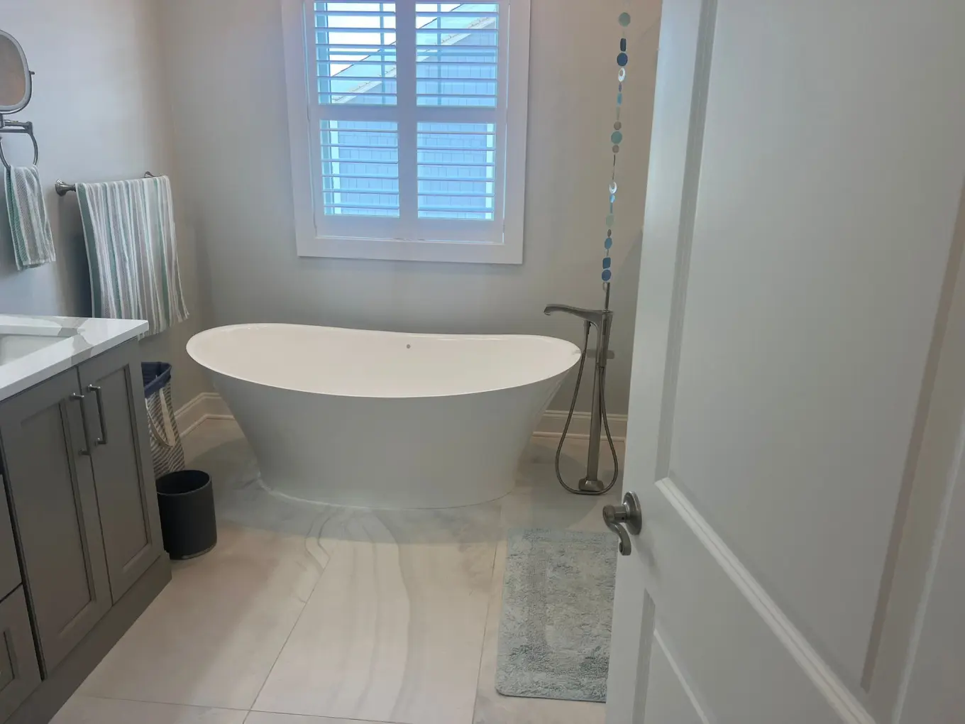 Spa-like bathroom renovation with marble accents and modern fixtures.